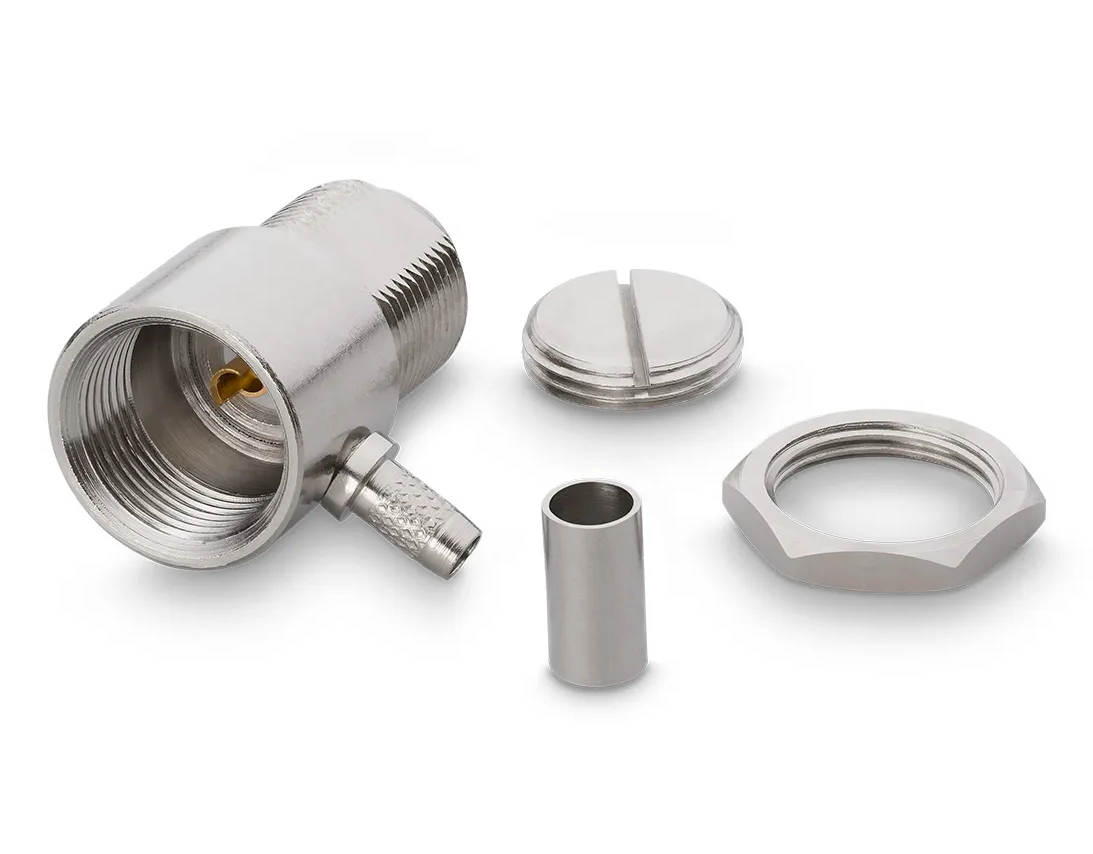 Conector UHF fêmea angular de crimpar para cabo RG/RGC58 (com porca) 10104